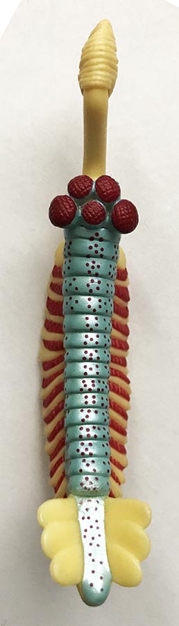The following images show the dorsal, right side, and ventral views (in that order) of Opabinia regalis, and lastly, a closeup of its five compound (faceted) eyes. Notice the segmented body, numerous legs, tail, fins, and a single (very large) claw. The model shown here is 9.5 cm long, but, as mentioned earlier, the original specimens are up to approximately 5.5 cm in length.