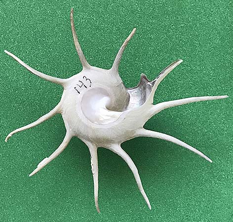 (B) Murex pecten Lightfoot, 1786, famously known as the “Venus comb,” is known from Japan to Queensland, Australia, and the Solomon Islands in the Pacific Ocean. The shell of this muricid excessively sharp spines on its three varices. Emanating from the lateral varices on each side of its shell is a row of spines that curve downward, thereby causing the shell to be elevated above the ocean floor and creating a protected area when the head of the gastropod extends outward in order to feed. Including the spines, this shell has a height of 13.5 cm, and a width of 8 cm.