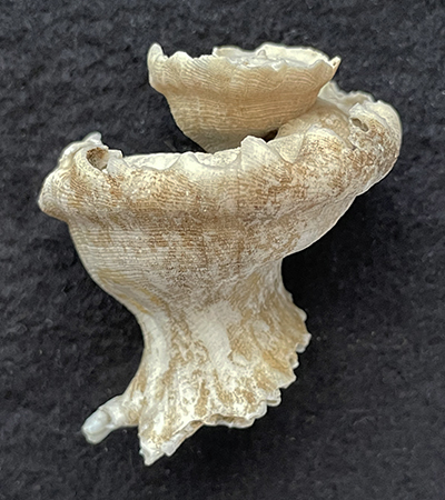 Two views (oblique top and bottom) of Astraea heliotropicum (Martyn, 1784). This deep-water marine gastropod, which is also endemic to New Zealand, was originally referred to by Martyn as the “sunburst star turban” or as the “circular saw shell.” This species belongs to family Turbinidae. The color of its shell is highly variable, and can be from white, gray, reddish brown, or blackish brown. This species lives in deep water.